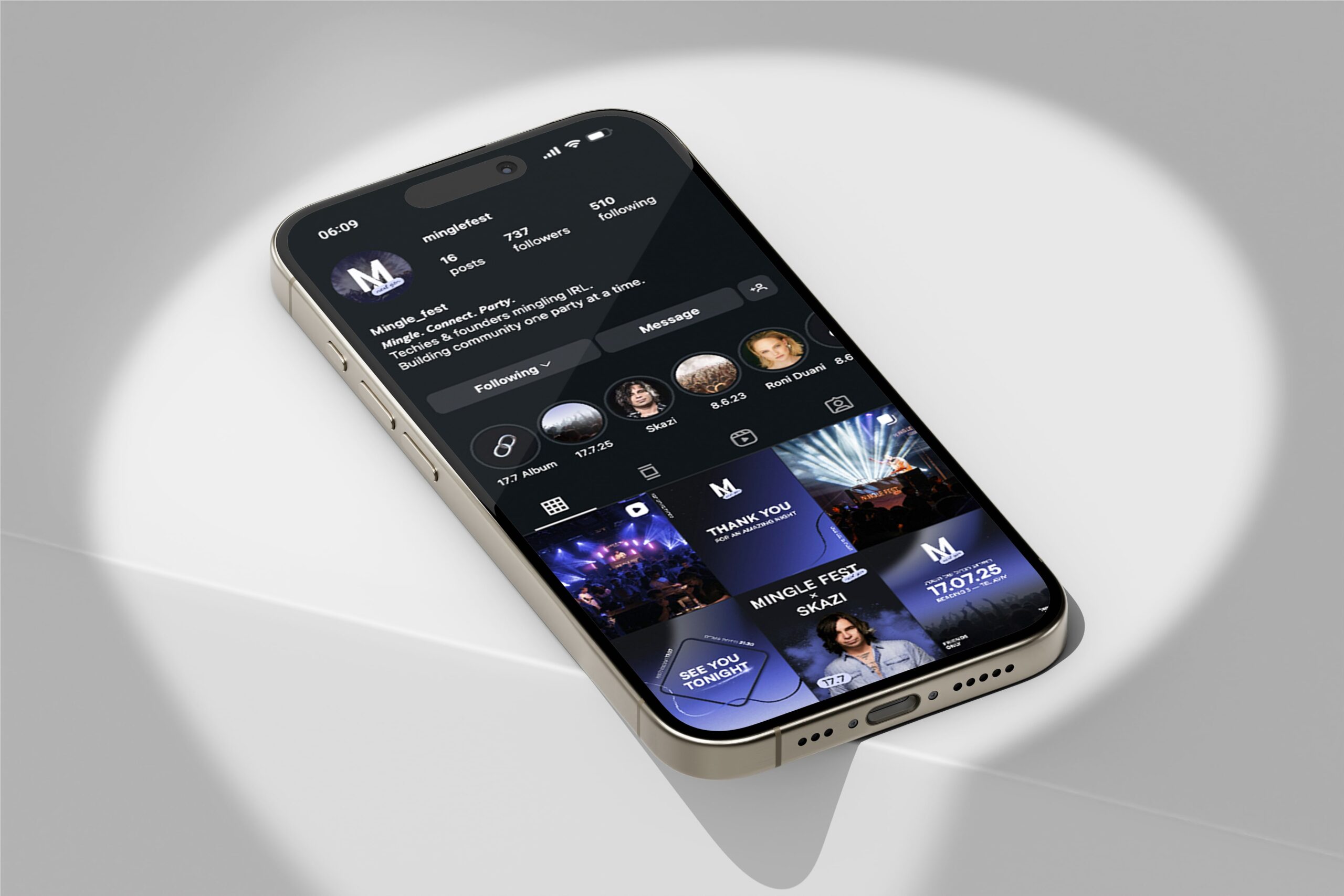 The work began with creating a new logo and visual language, which was then applied across the Instagram profile to better attract the target audience of tech professionals and founders. This included updating the profile and highlight visuals, refining the bio, and consistently creating posts and stories leading up to ticket sales and the event itself.